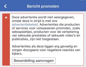 Facebook is het klaarblijkelijk met hem eens, want mijn promotie advertentie is afgekeurd, want deze mogen geen teksten bevatten die het presteren van seksuele prestaties bevorderen. Ahum.