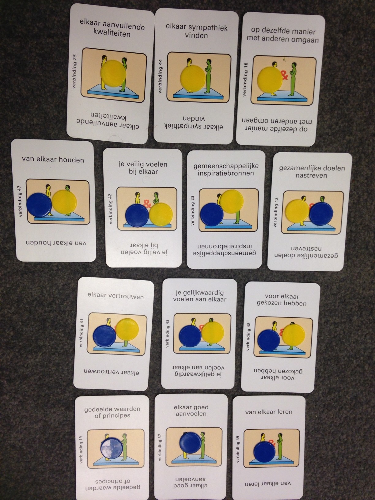 De verbinding tussen Loes en mij, is gebouwd op veiligheid van een existentieel niveau. Het is fijn als een ander je dit kan spiegelen. Veiligheid komt ten diepste ook vanuit jezelf. Om dat te kunnen voelen bij is het nodig dat je terug kunt vallen op jezelf, op jouw eigen ruimte, op jouw eigen basis. Loes heeft haar issues uitgewerkt in de relatie met haar man, ik op mijn manier met de vele liefdes in mijn leven. Allebei voelen we hoe belangrijk het is om van jezelf te kunnen houden en de veiligheid ook in jezelf te kunnen voelen. In het werken met de verbindingskaartjes van het Relatiespel van Peter Gerrickens, werd dit tussen Loes en mij die lesdag perfect gespiegeld.