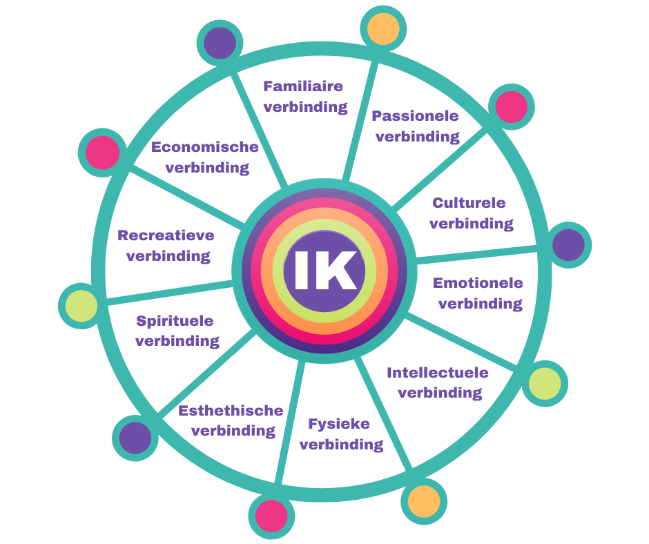 Destijds was ik zelf helemaal enthousiast over het effect van het gebruik van het Verbindingswiel© op mijn persoonlijke relatiesituatie. Zeker omdat ik zelf polyamoreus ben en meerdere geliefden in mijn leven heb met wie ik mij op verschillende manieren verbonden voel. Een eureka moment ontstond toen ik in een oogopslag een overzicht kreeg van mijn relaties en wat deze relatieverbindingen mij vertelde over de relatie met mezelf.
