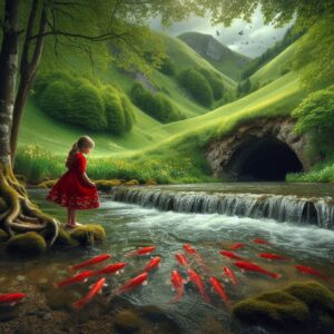 In de ogen van mijn geliefde zie ik een klein meisje in een rode jurk. Ze is blij, en springt en huppelt buiten over de groene heuvels. Ze komt bij een beek, waar de vissen haar uitnodigen in het water te komen. Ze durft niet. De vissen proberen haar over te halen om haar angst te overwinnen, het is zo heerlijk in het water en leuk om samen te spelen, maar nee, ze durft niet. Ze loopt terug naar de heuvel en gaat de andere kant op. Daar kom ze bij een grot. Avontuurlijk als ze is stapt ze naar binnen, het licht achter zich in de gaten houdend. In de verte wordt de donkere grot af en toe verlicht door vuur, maar ook hier durft ze niet verder te gaan. De duisternis schrikt haar af.