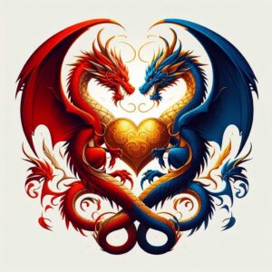 De draken gaan met elkaar in gevecht, maar voordat ze dat doen, verbinden ze hun goudgele harten met elkaar. Dat is heel belangrijk, zeggen ze tegen ons, dat je harten altijd met elkaar verbonden zijn, voordat je met elkaar in een uitdagend gevecht gaat. Ook tijdens het gevecht is het de bedoeling dat de harten verbonden blijven, want anders gaat het mis. Daar moet je altijd op letten, waarschuwen ze ons. We knikken dat we het begrijpen. Mijn geliefde en ik liggen ondertussen met onze harten tegen elkaar.