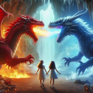 Dan gaan ze op weg naar de grot. Hand in hand lopen ze de grot in, gelokt door het licht van het vuur in de verte. Achterin de grot ligt een grote rode draak. Hij laat hen zijn vuur zien, zegt dat hij blij is dat ze er zijn, want nu bestaat hij pas. Want als er niemand is om zijn kracht aan te laten zien, heeft hij geen bestaansrecht en doet zijn leven er niet toe. Dan is hij niemand. Dan is hij niets. Nu de twee kleine meisjes er zijn kan hij zich groot en machtig voelen. Kom, ik zal jullie mijn kracht laten zien, zegt hij dankbaar. Ze gaan aan de kant van de grot zitten en kijken naar het schouwspel van de vuurspuwende draak. Het is heel indrukwekkend.