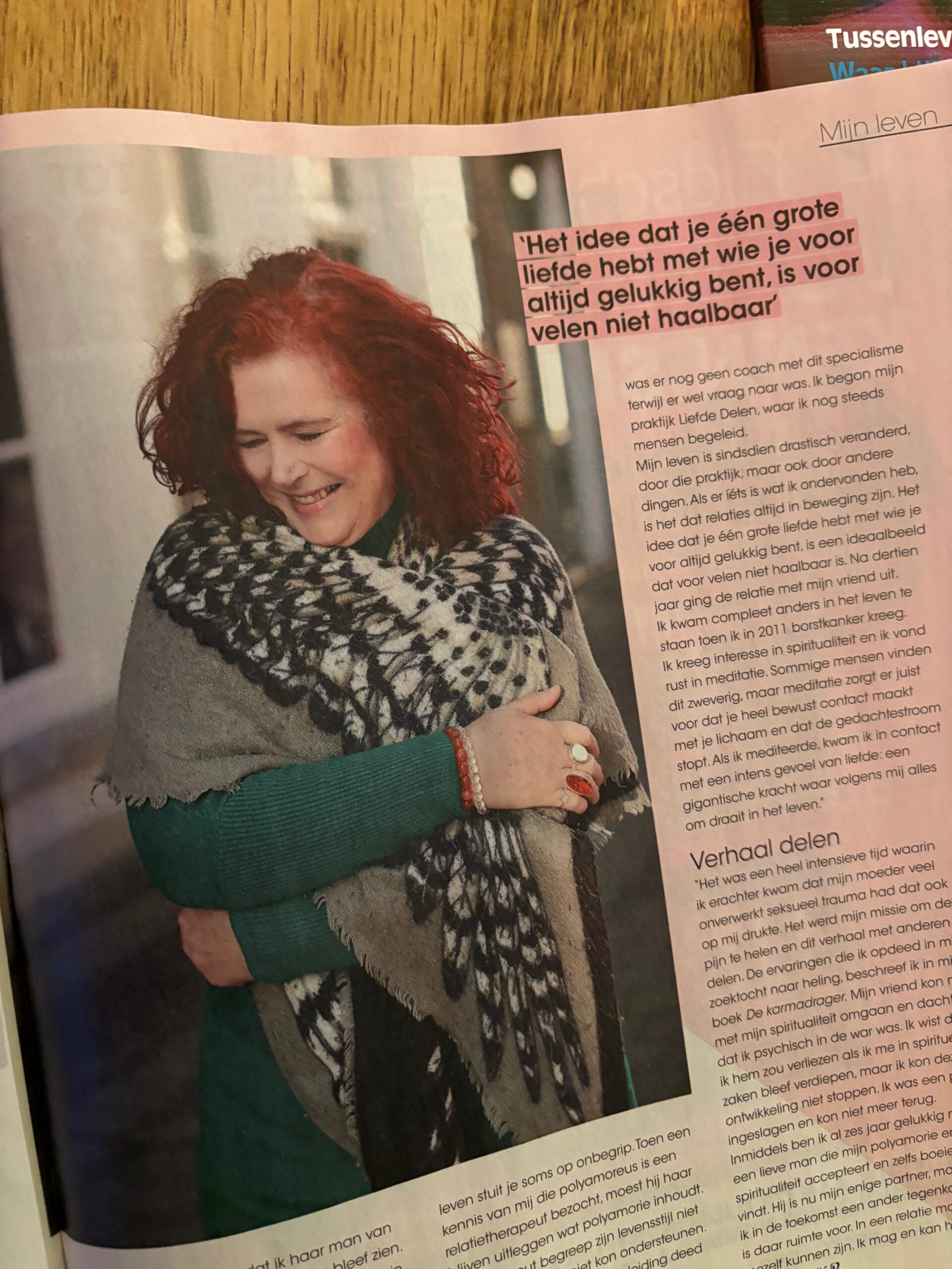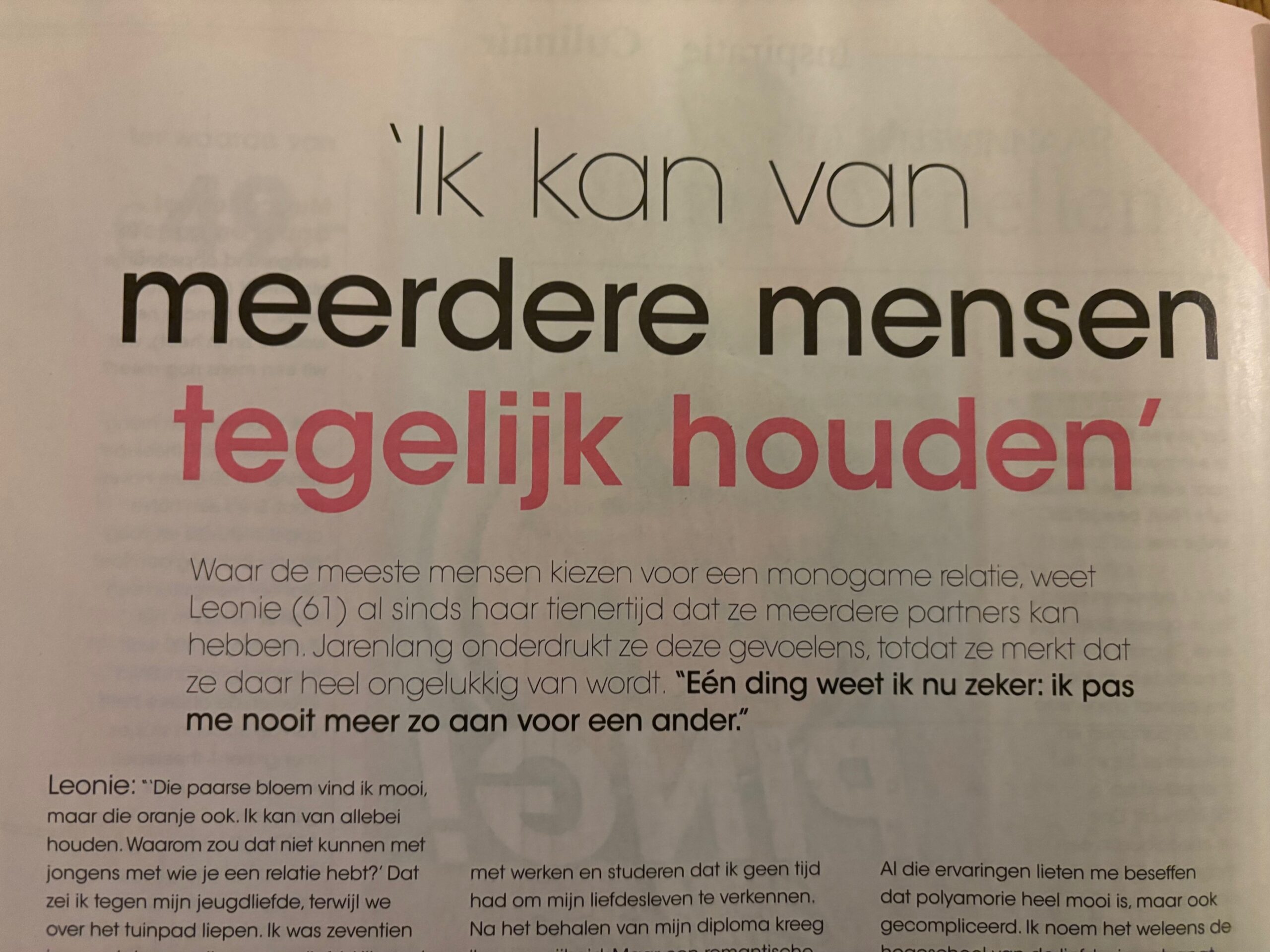 Onlangs werd ik door een journaliste van tijdschrift Vriendin geïnterviewd over mijn liefdesleven tot nu toe. Dat zijn best wat jaartjes want inmiddels ben ik 62 jaar jong. We keken terug naar vanaf mijn tienertijd en vooral naar de jaren dat ik diverse soorten liefdesrelaties had, van monogaam en een huwelijk, polyamorie tot een open latrelatie in verschillende relatiesituaties. Ook gevoel van een derde zijn in een relatie ken ik ook al te goed, en alle emoties die dat met zich mee heeft gebracht.
