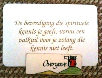 Na de slotmeditatie trokken we een engelenkaartje en een inspiratiekaartje. Toeval bestaat niet. Voor mij is het inmiddels bewezen. Want uiteindelijk gaat het erom dat we iets doen met onze inzichten. Zo lang we alleen maar blijven leren en nieuwe kennis op blijven doen, verandert er niets. Inzicht + Actie = Verandering. Een eenvoudige rekensom die mij uitnodigt tot overgave tot het zetten van een nieuwe stap. Voor mij is dat het schrijven van deze blog.