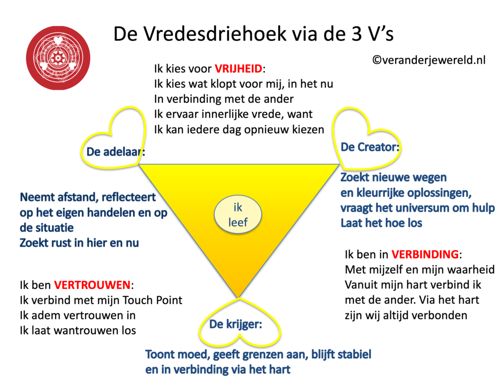De droomdriehoek kan getransformeerd worden naar een vredesdriehoek via deze drie basiswaarden: Vertrouwen, Verbinding en Vrijheid. Want in de vrijheid ontmoet je jouw eigen verantwoordelijkheid en autonomie, voor jezelf en voor de ander. In de verbinding vind je de zorg en afstemming op de ander en in het vertrouwen vind je jouw geloof in de liefde en het leven. De liefde tussen jou en je partner die altijd exclusief is, of dat er nu een of meer zijn, omdat iedereen een uniek wezen is. Durf jij te vertrouwen op jullie onuitsprekelijke band die er altijd is? Vertrouw jij op Ik Ben, daar waar alle rollen vanuit beweging samenkomen? Durf jij te Leven vanuit je hart door te bewegen via de verschillende rollen?